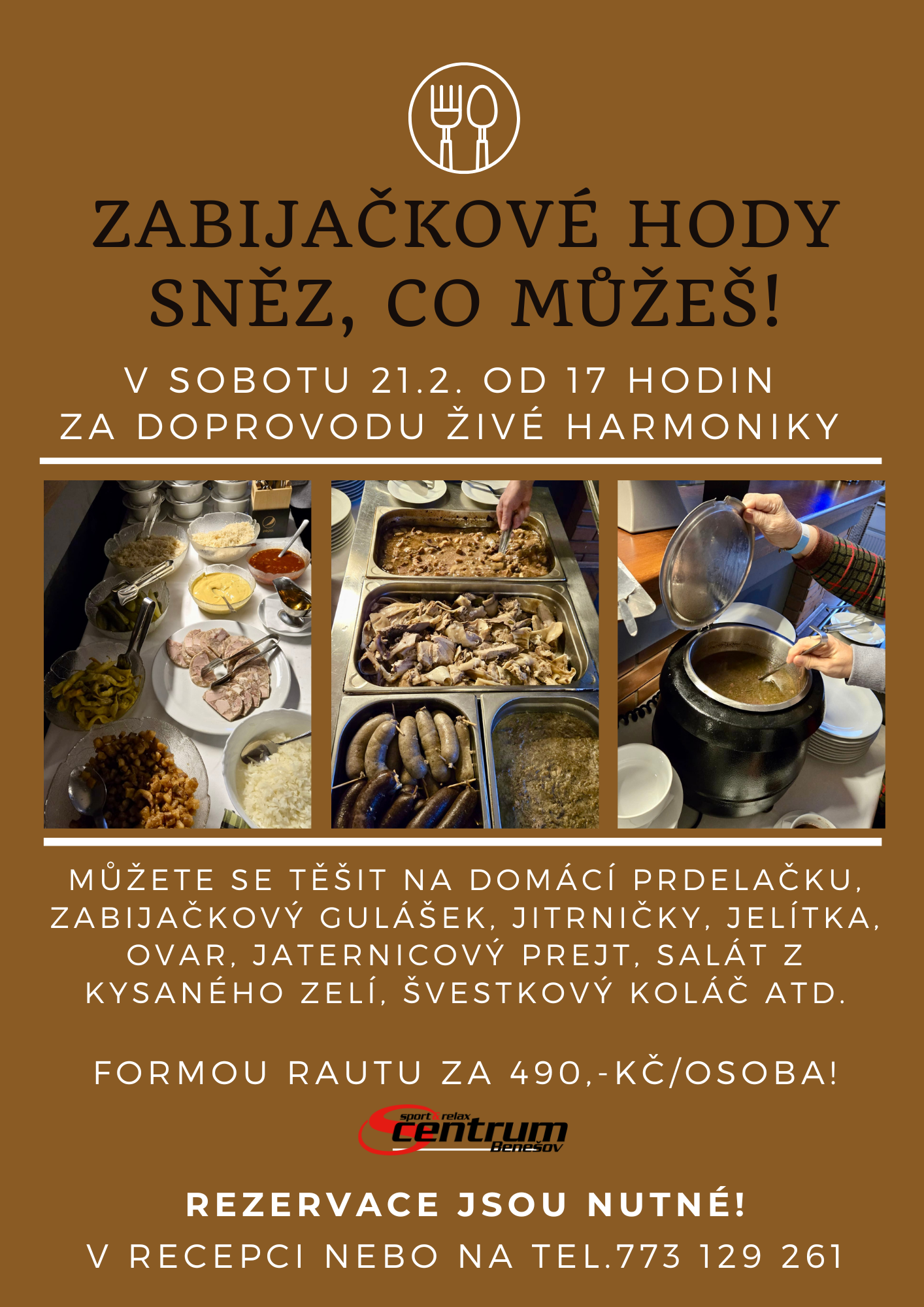 Můžete se těšit na domácí prdelačku, zabijačkový gulášek, jitrničky, jelítka, ovar, jaternicový prejt, salát z kysaného zelí, švestkový koláš a další.
