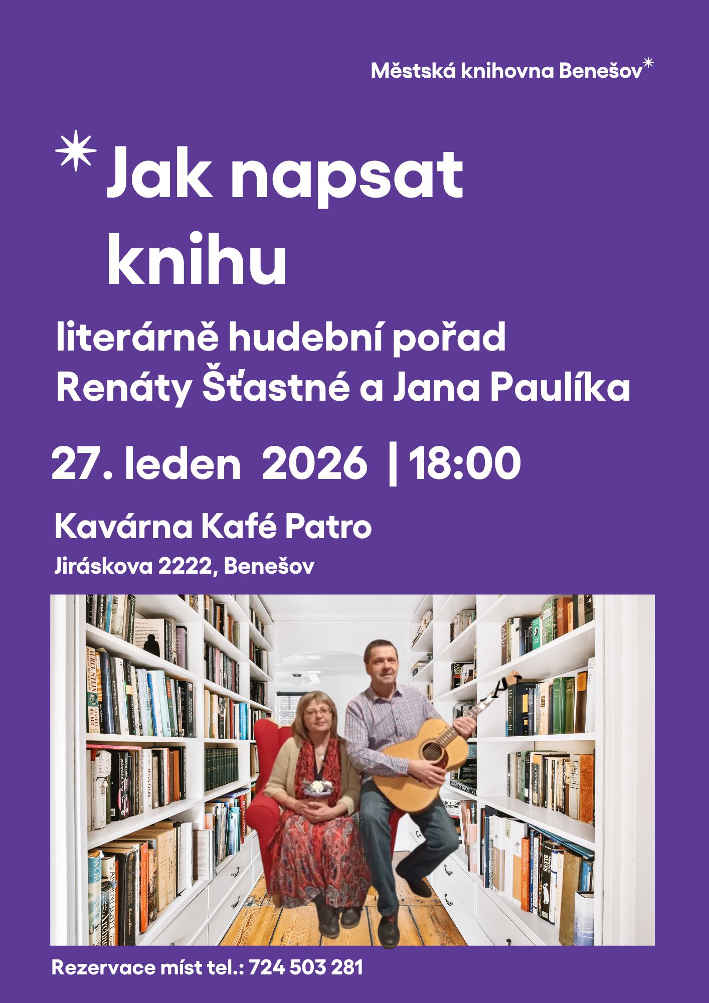 Literárně hudební večer s vyprávěním a autorským čtením spisovatelky Renáty Šťastné o tom, jak napsat knihu, doplněné zpíváním a tóny sólové kytary v podání kytaristy Jana Paulíka.