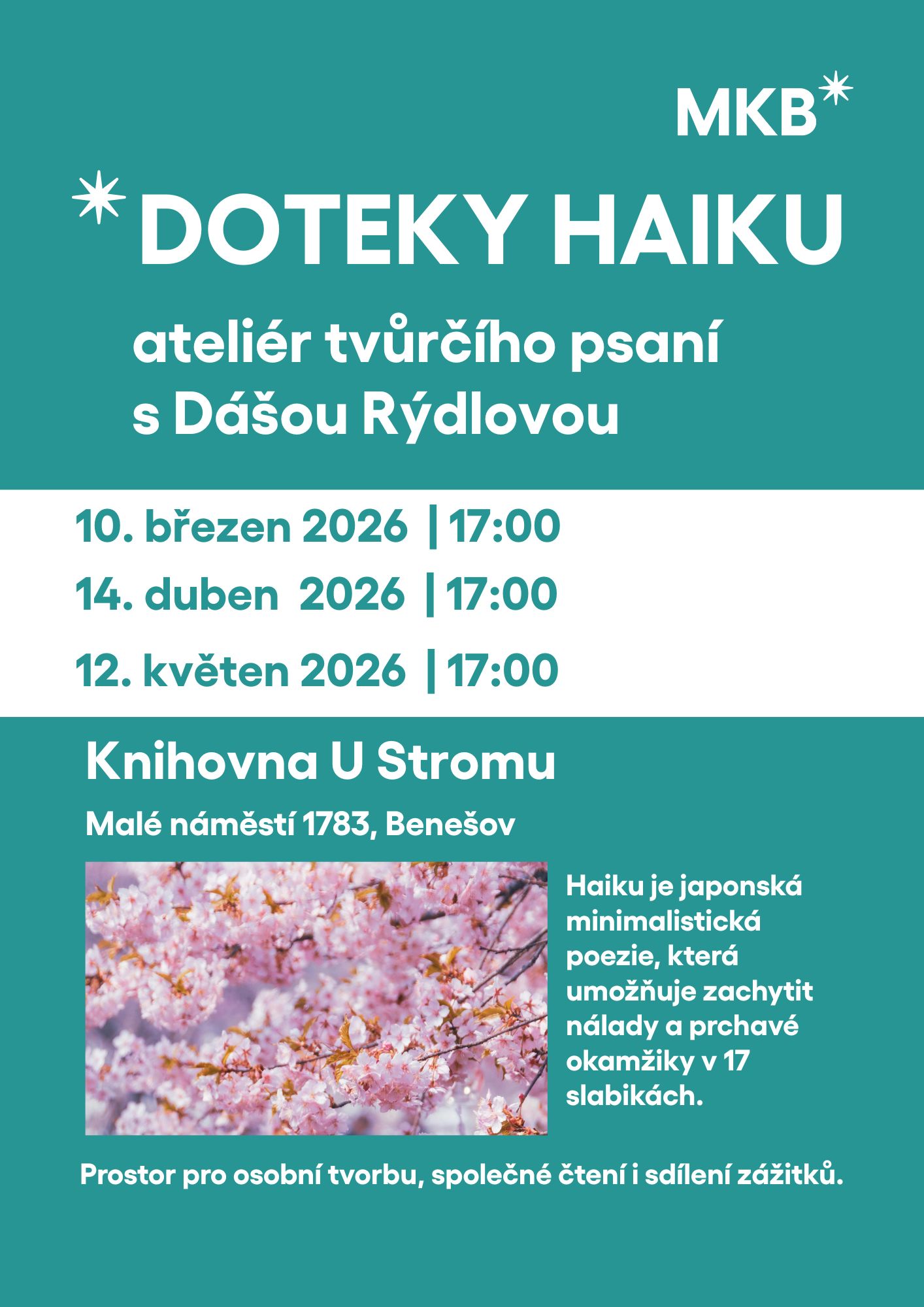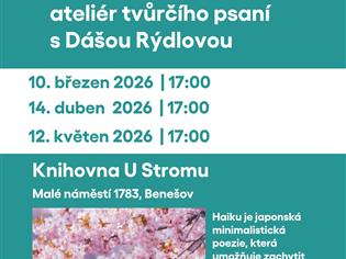 Ateliér tvůrčího psaní s Dášou Rýdlovou. Haiku je japonská minimalistická poezie, která umožňuje zachytit nálady a prchavé okamžiky v 17 slabikách. Těšte se na povídání lektorky Dáši Rýdlové, prostor pro osobní tvorbu, společné čtení i sdílení zážitků.